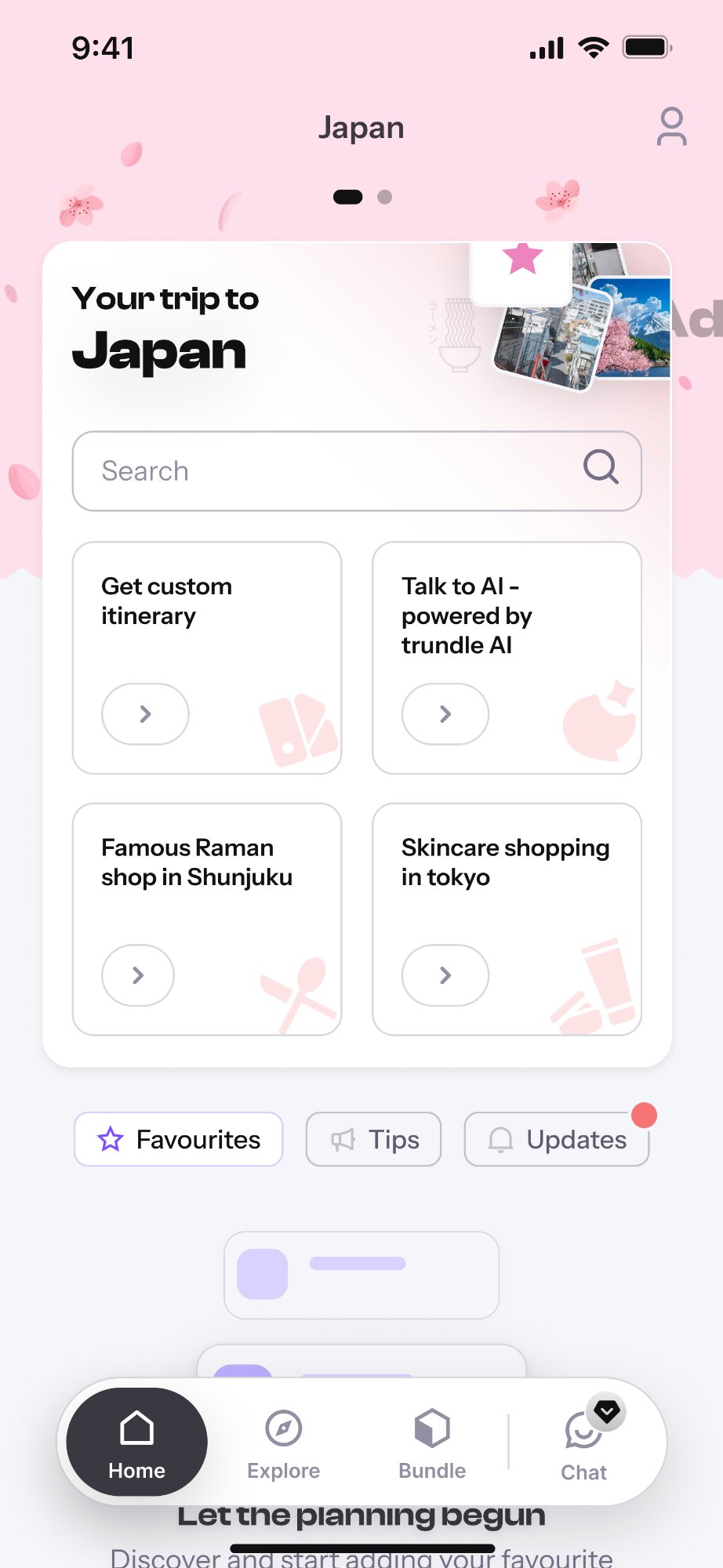 The Trundle Mobile App is an AI-powered travel companion that helps users explore destinations, discover hidden gems, and plan trips effortlessly on their smartphones. Featuring an intuitive interface with real-time chat, personalized recommendations, and seamless booking integrations, the app delivers a premium mobile travel experience. Designed with a modern UI and smooth animations, Trundle makes travel planning enjoyable and accessible anytime, anywhere.